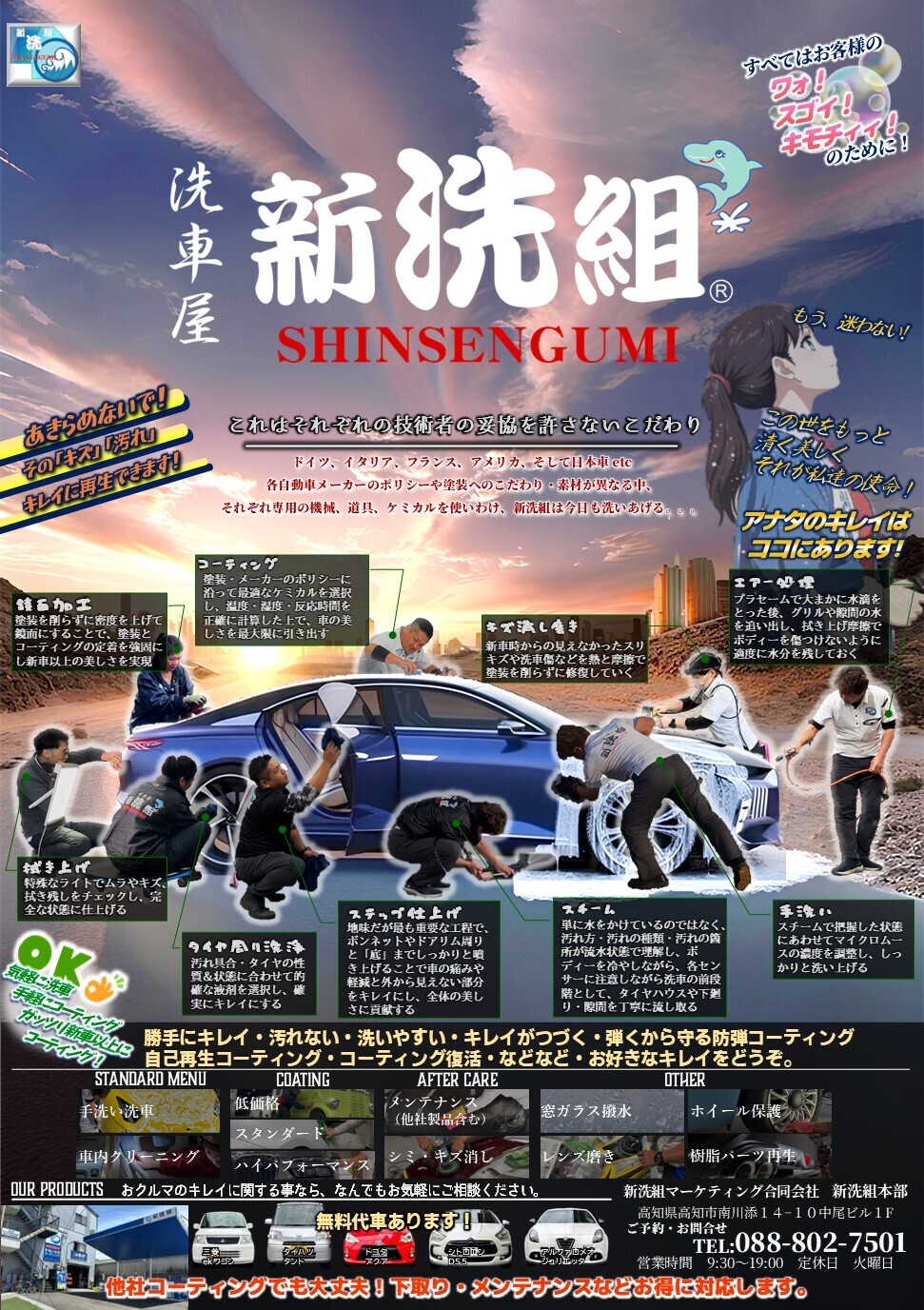 電話でのご予約・お問合せはこちら 営業時間 9時半~19時 火曜日定休日 お車のサイズについて 当店では洗車料金を公平に保つ為に『現行型』の体積(全長×全幅×全高)を基準に、形状を考慮したうえで、作成した車種分類表に基づきサイズ分けを行っています。 SSサイズ例 ラパン、N-WGN、ハスラー など Sサイズ例 N-BOX、アクア、フィット など Mサイズ例 プリウス、シエンタ、カローラ、BMW 3シリーズ など Lサイズ例 クラウン、ベンツEクラス、ヴェゼル、アウトバック など LLサイズ例 ヴェルファイア、セレナ、CX-5 など 電話でのご予約・お問合せはこちら 営業時間 9時半~19時 火曜日定休日